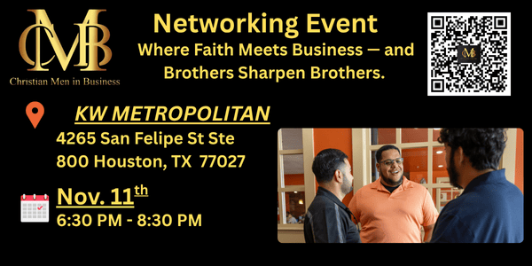 Join us for a powerful evening of connection, conversation, and community at the Christian Men in Business (CMB) Networking Night!This is more than networking — it’s a night to build real relationships, exchange ideas, and encourage one another in faith and business. Whether you’re an entrepreneur, professional, or leader, you’ll leave inspired, equipped, and recharged to lead with purpose.